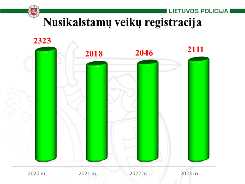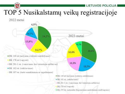 Praėję metai niekuo neišsiskiria, dominuoja šios 5 nusikalstamų veikų rūšys. Kalbant procentine išraiška, tai 20,6 proc. nuo visų užregistruotų nusikalstamų veikų sudaro nusikalstamos veikos pagal BK 140 str., 13,7 proc. sudaro nusikalstamos veikos pagal BK 182 str., 12,6 proc. nuo visų užregistruotų nusikalstamų veikų sudaro nusikalstamos veikos pagal BK 178 str., 12,3 proc. sudaro nusikaltimai susiję su vairuotojų vairavimu esant apsvaigus (neblaiviam), t.y. BK 2811 str. ir 4,7 proc. nusikalstamos veikos pagal BK 259 str.