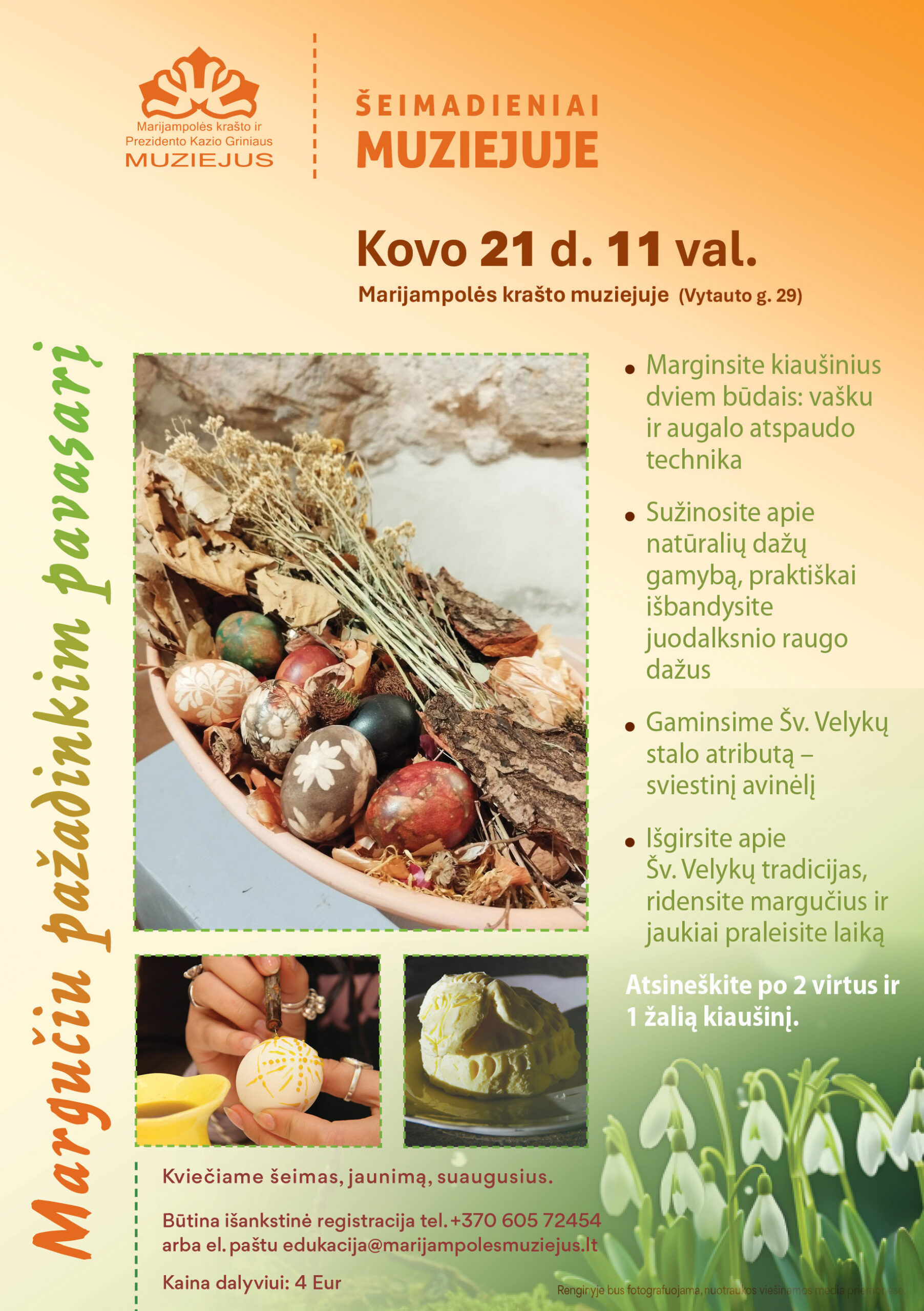 • Išgirsite apie Šv. Velykų tradicijas, patyrinėsime muziejuje saugomų margučių kolekciją
