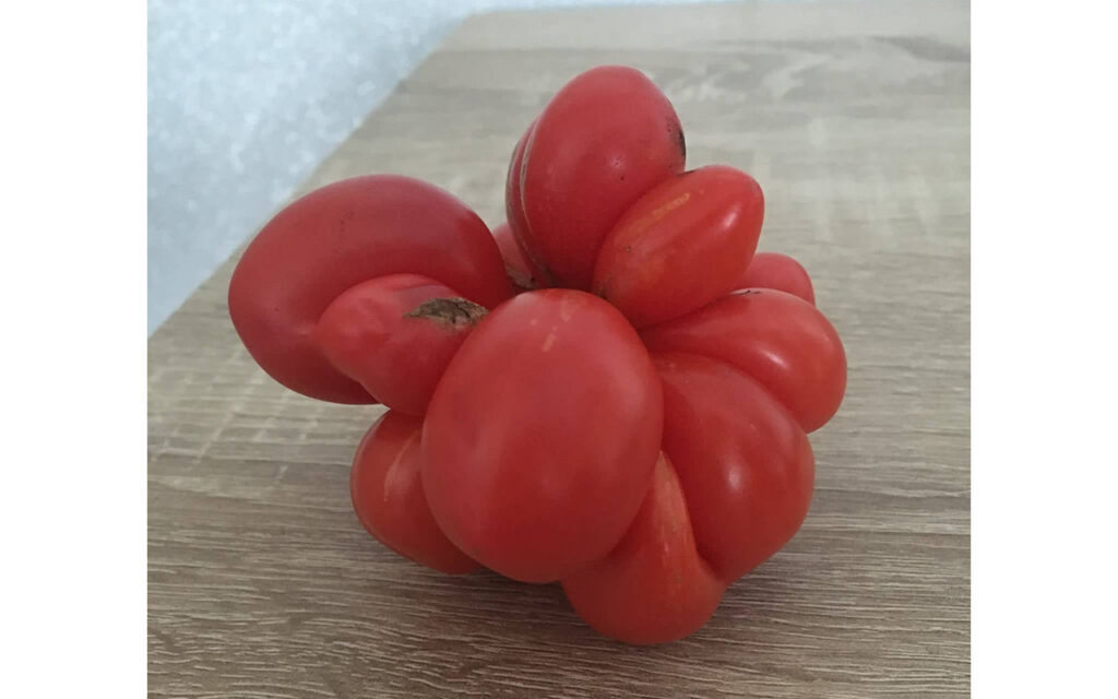 Štai taip nusišypsojo gamta, įprastą pomidoro vaisiaus formą iškeitusi į gėlės žiedą primenančią kompoziciją.